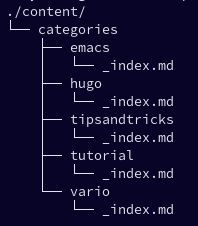 Un’altra funzionalità di HUGO è quella di poter definire dei parametri personalizzati per le tassonomie, basandomi su questo ho creato questo tipo di gerarchia partendo sempre dalla cartella principale di HUGO <HUGO_SRC>/content/<TAXONOMY>/<TAG_NAME>/_index.md dove al posto di <TAXONOMY> possiamo mettere una delle tassonomie standard|custom, nel mio caso userò le categorie, e al posto di <TAG_NAME> dovremmo usare il nome delle categorie che vogliamo, per esempio abbiamo definito una categoria emacs la struttura dovrebbe avere questo aspetto <HUGO_SRC>/content/categories/emacs/_index.md.